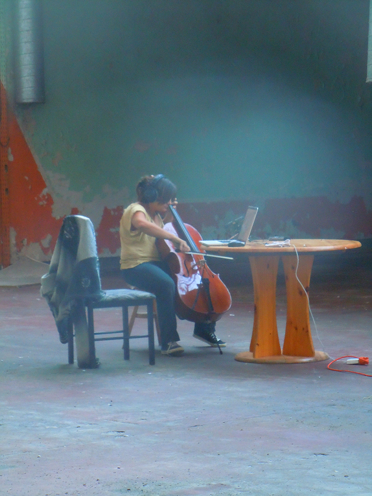 Tandis que Nuria y Miguel, sur la scène inventaient le spectacle, Mako & moi, dans l’atelier, créions la bande-son. Elle avait son cello & son violon, moi ma guitare, mon ordi de composition & un micro. Il y avait de surcroit un vieux piano à queue en phase terminale d’accordage &, dans une autre partie du bâtiment, un couple de brocanteurs avec leur caverne d’ali-baba, qui nous ont gracieusement offert une demi-douzaine de verres en crystal (j’avais pensé à ça dès que j’eu entendu parler de la scène des jeux d’eau).