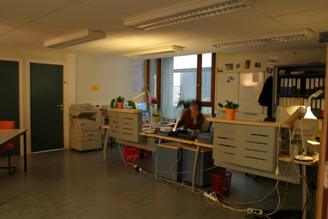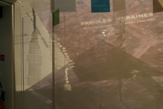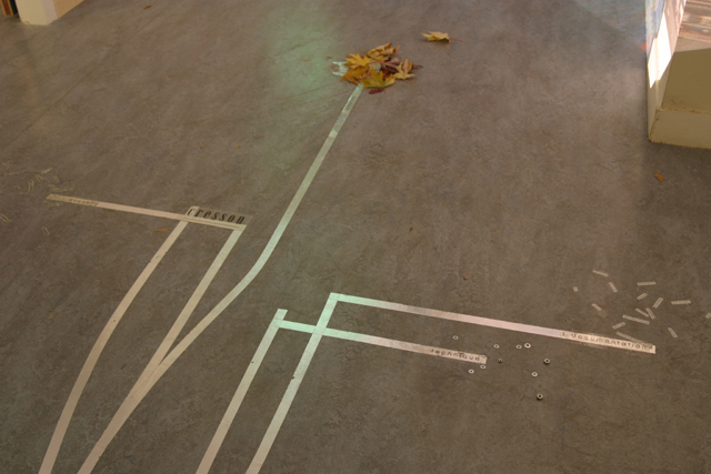 Le ruban d’aluminium était le fil conducteur que les scénographes (Hannia & Agneska) avaient choisi à l’échelle de l’ensag / il arrivait à notre porte &… ? se décomposait en qq rails de terminus entrecroisés (la délicatesse avec laquelle on a travaillé avec JJD la courbure d’un matériaux a priori destiné à être rectiligne….) / ensuite on indique 4 directions : accueil / recherche / documentation / technique (trombones / feuilles / mots / boulons).