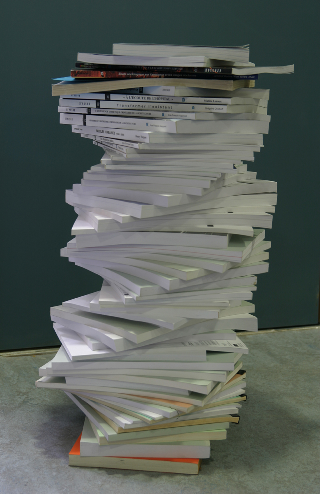 Il s’agissait (cahier des charges) d’exposer nos longs listings de publications / en 4 ou cinq colonnes : ouvrages / rapports de recherches / thèses / (multi) media / j’avais dans l’idée le poster mobile : qui non seulement supporte un contenu (texte/image) lisible mais attire le regard par son (léger) mouvement dans l’espace / ne pas faire juste une image contre un mur /
