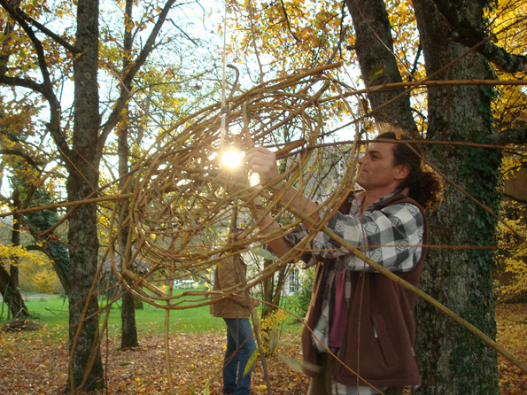 Je sais que je fabrique, ave les osiers qu’on trouve sur place, des structures tressées & suspensives qui peuvent être perçues comme des objets ou comme des espaces, ou les deux, ou d’autres manières encore.